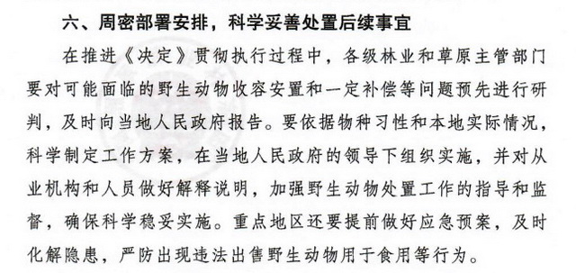 通知称,在推进《决定》贯彻执行过程中,各级林业和草原主管部门要对可能面临的野生动物收容安置和一定补偿等问题预先进行研判,及时向当地人民政府报告。