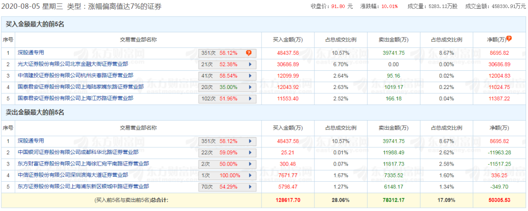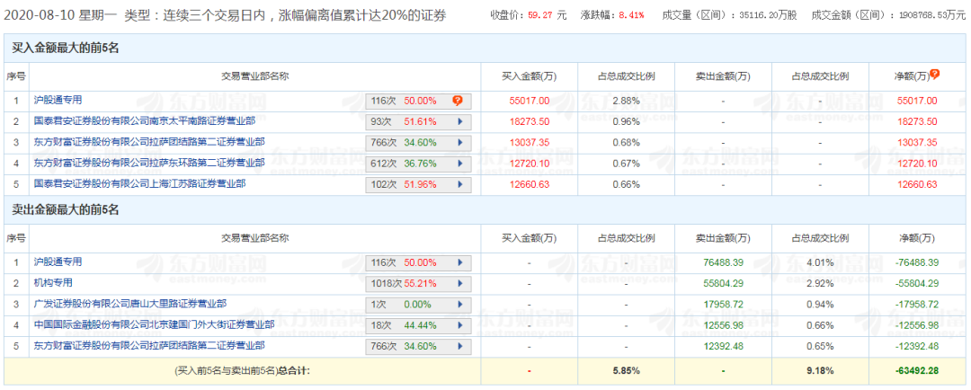 Choice数据显示,8月3日至10日,已经有8张交易所公布的龙虎榜中,出现上榜席位成交总额超过20亿元的情形,涉及中信建投、紫光国微、沃森生物、君正集团、达安基因5只股票。