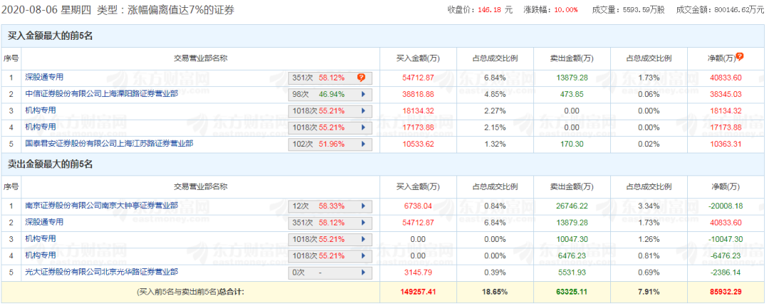 在一张龙虎榜中,上榜席位成交总额超过20亿元的情况其实较为少见。例如今年6月份,全月仅有两张龙虎榜中出现相似情况,涉及公司中国中免和格力地产,为当时免税概念的两大龙头。