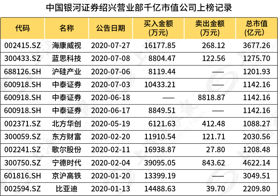 中国银河证券绍兴营业部千亿市值公司上榜记录