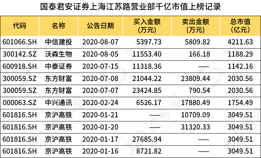 国泰君安证券上海江苏路营业部千亿市值上榜记录