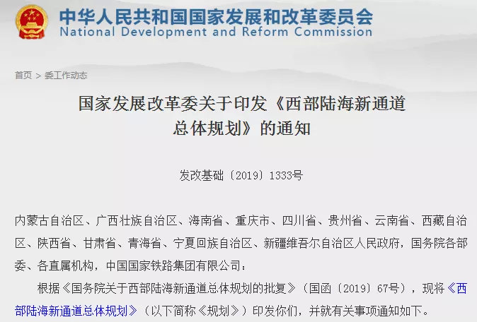 国家发改委8月15日消息,为深化陆海双向开放、推进西部大开发形成新格局,近日,国家发改委印发《西部陆海新通道总体规划》(以下简称《规划》)。