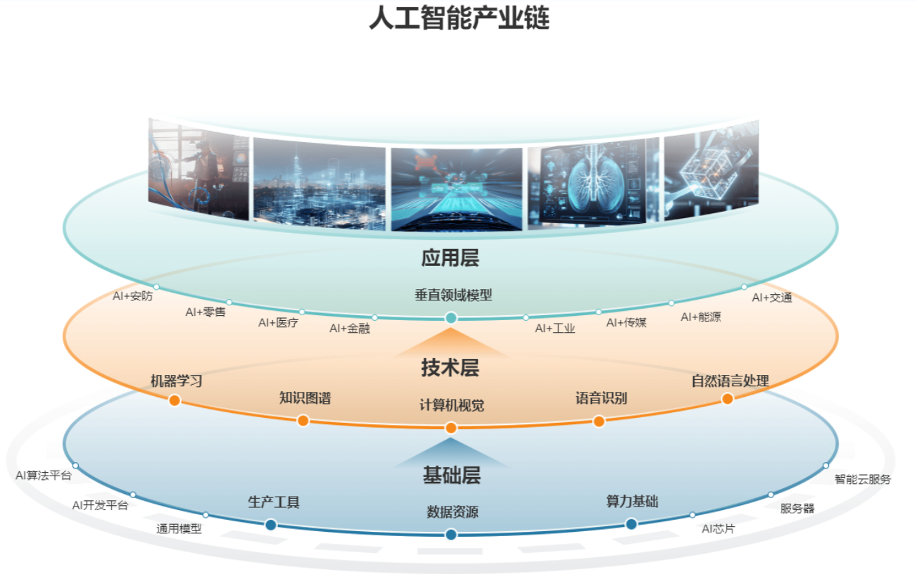 人工智能的产业链大致分为上游的基础支持层、中游的中间技术层和下游的应用层。
