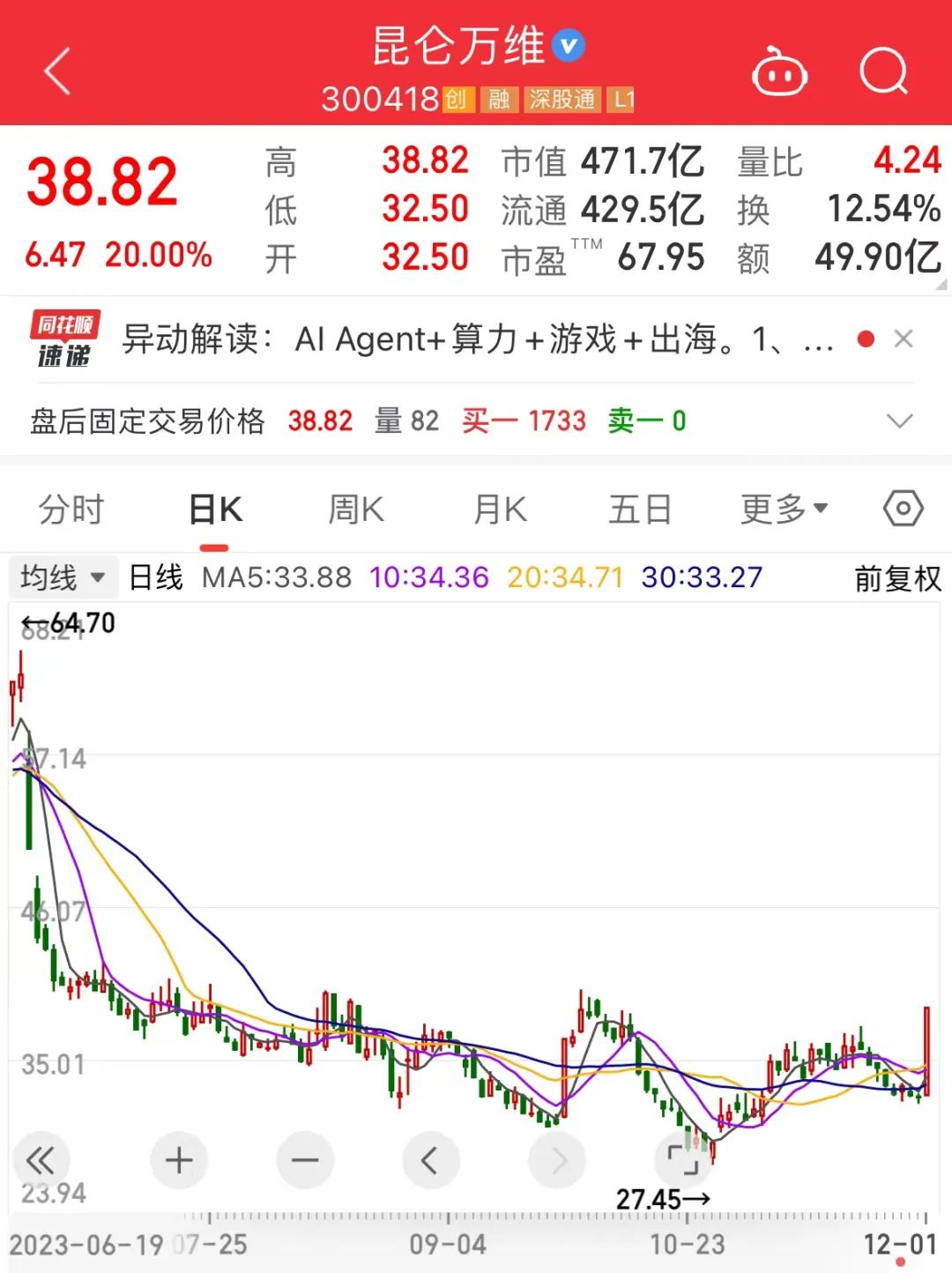 12月1日,AI板块迎来大反弹,Wind人工智能概念指数大涨4.38%,“老妖股”昆仑万维20cm涨停;截至目前,该股今年来自最低点的最大涨幅达3.98倍,自最高点的最大跌幅超六成。