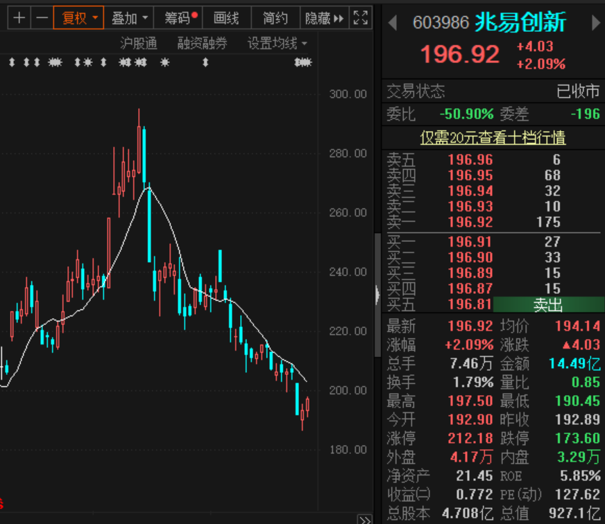 作为芯片概念股龙头之一,公司股价连续4周下跌,最新价不足200元,该股今年2月底股价一度超过300元。截至最新,该股市值超过927亿元。