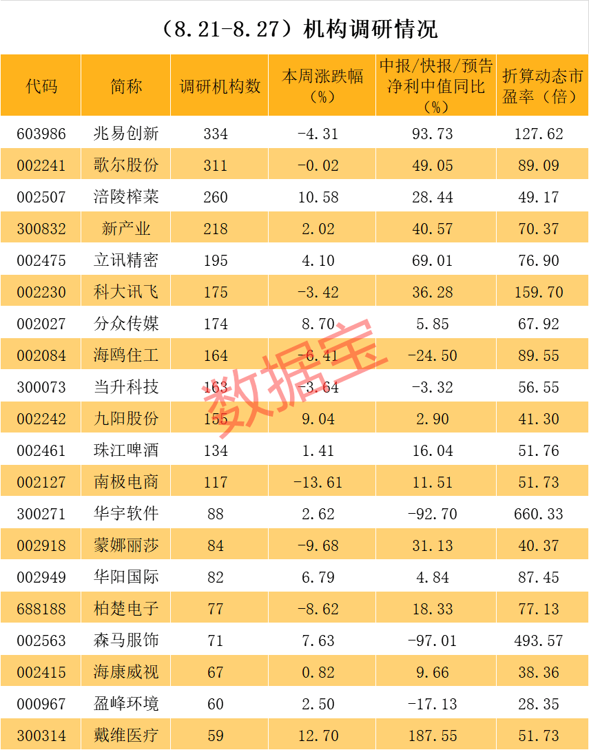 兆易创新成为近一周调研机构数量最多的股票。数据显示,合计有334家机构调研了该公司,包括92家基金公司、48家证券公司、37家私募、20家保险公司、13家海外机构等。在公司披露半年报“成绩单”当日,景林资产、嘉实基金、凯丰投资等多家知名机构电话调研了兆易创新。