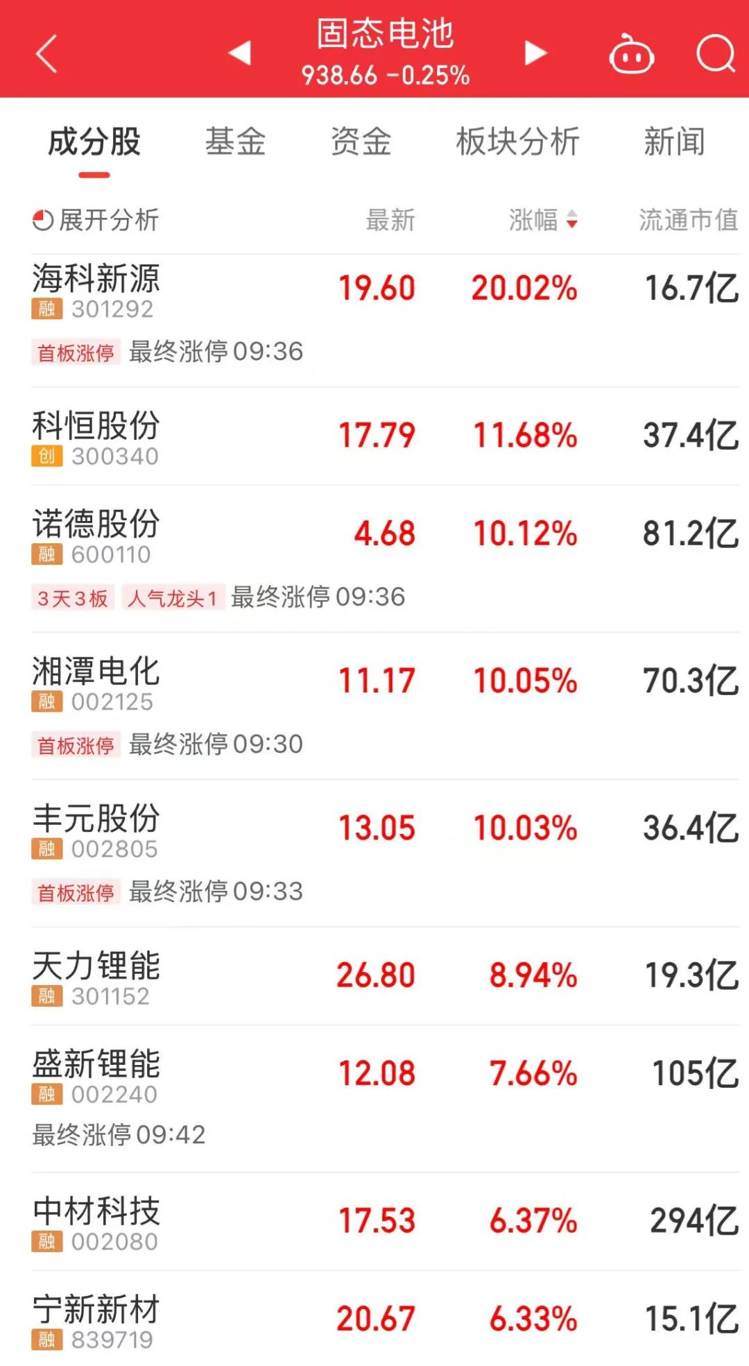 今天上午,固态电池板块盘中大幅走强,海科新源等个股大涨。