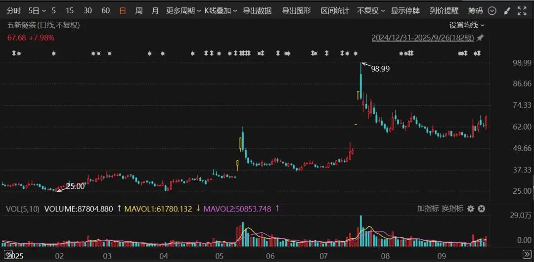 在并购案推进过程中,市场给予了积极反应。今年以来五新隧装股价表现亮眼,截至9月26日收盘,五新隧装今年以来累计涨幅134.27%。
