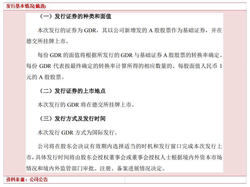 全球存托凭证(GDR)简单理解是A股上市公司在境外的二次上市,但是公司无需在境外直接发行股票,而是以A股股票为基础证券在境外发行存托凭证,一定时间之后可以按比例转换成A股股份,类似于A股增发。