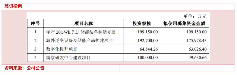 具体来看,拟使用20亿元用于合肥20GWh先进储能装备制造项目提升国内储能产能,项目达产后投资财务内部收益率为20.74%(税后),投资回收期为6.22年(税后,含建设期)。