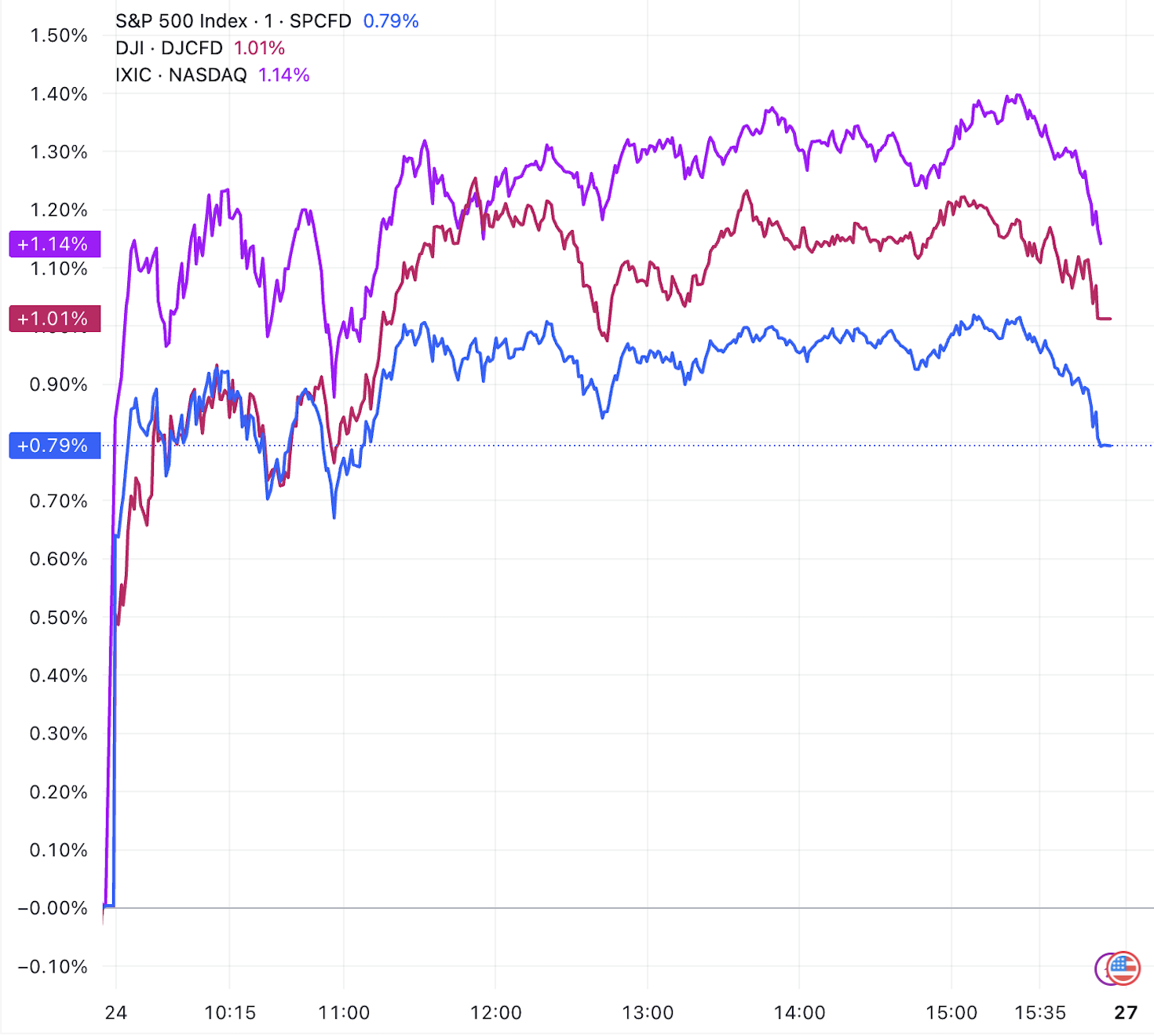 截至收盘,道琼斯指数涨1.01%,报47,207.12点;标普500指数涨0.79%,报6,791.69点;纳斯达克指数涨1.15%,报23,204.87点。