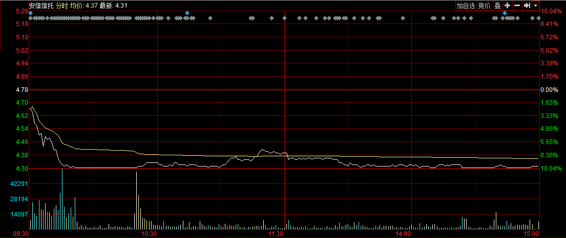 6月10日,上述回复函披露的首个交易日,安信信托开盘大跌,盘中9:45左右,该股出现跌停态势,收盘个股跌停,跌幅9.83%,报4.31元。