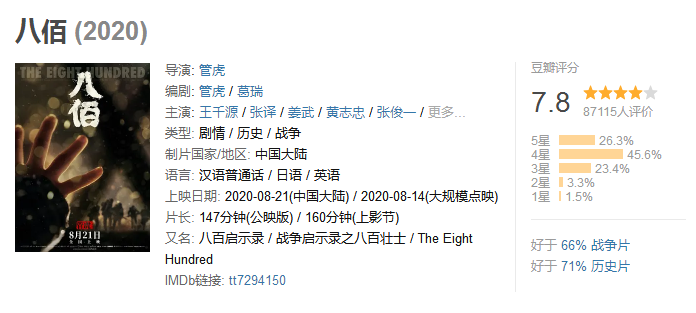 《八佰》电影内容的背景是1937年沪淞会战的最后一役,“八百壮士”奉命坚守上海四行仓库,以少敌多抵抗四天四夜的故事,是亚洲首部全片使用IMAX摄影机拍摄的商业电影,豆瓣评分为7.8分。