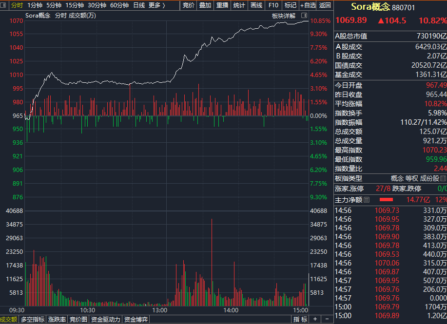 值得关注的是,就在6月26日当天,A股市场上的AI概念股集体大涨,其中,Sora概念涨幅超过10%,多模态AI、AIGC、ChatGPT等概念板块涨幅均超过6%。当虹科技、因赛集团、中文在线、会畅通讯、信雅达等近20只AI概念股涨停或涨超10%。