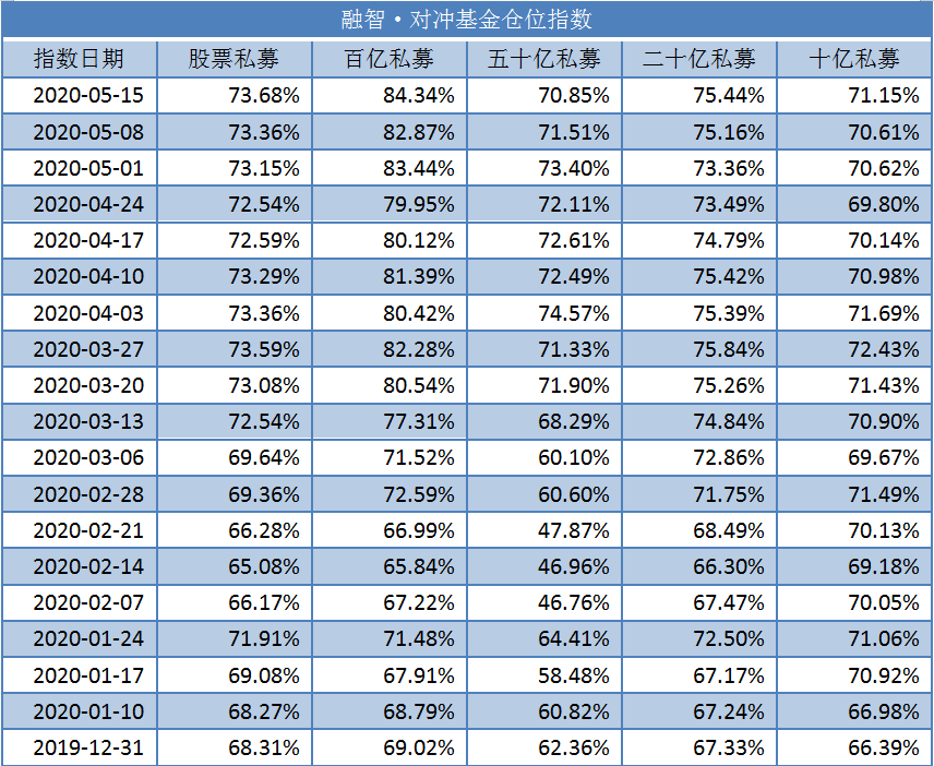 除北向资金不断加仓外,私募方面也同样在加仓。私募排排网组合大师数据显示,截至5月15日,股票私募整体仓位指数为73.68%,创近一年来的新高,环比加仓了0.32个百分点,51.58%的股票私募仓位在八成以上。分规模来看,百亿私募仓位最高、加仓幅度最大,最新百亿股票私募整体仓位指数为84.34%,创近一年的新高,环比加仓1.47个百分点,其中75.44%的百亿股票私募仓位在八成以上。