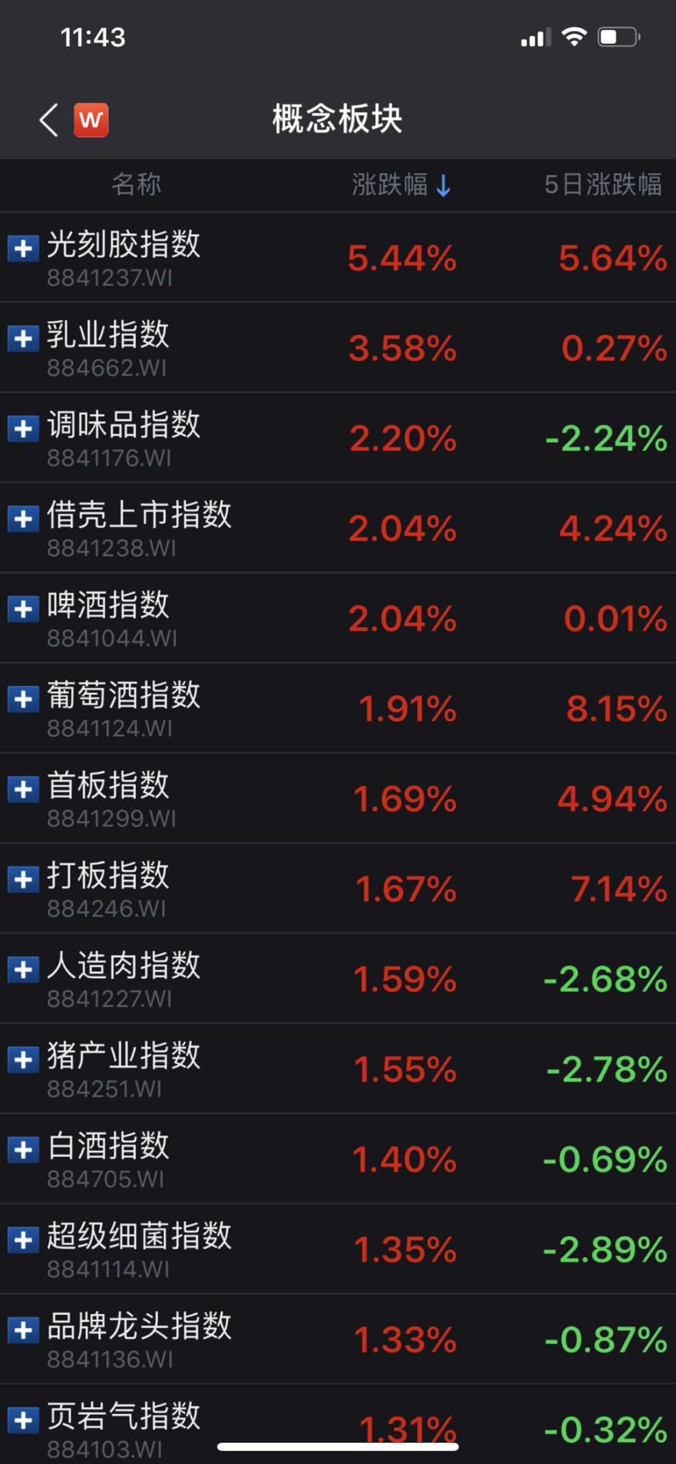 概念板块中,光刻胶、乳业、调味品板块涨幅居前,光线、网络可视化、WIFI等板块跌幅居前。