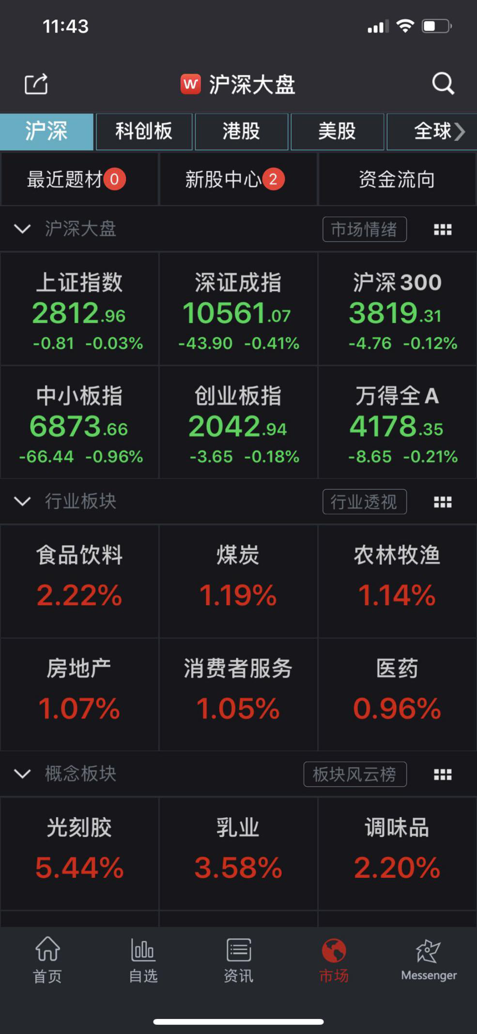 今日,两市继续调整,截至午间收盘,上证指数下跌0.03%,报2812.96点;深证成指下跌0.41%,报10561.07点;创业板指下跌0.18%,报2042.94点。连续调整之下,上证指数逼近2800点,早盘最低报2802.47点。盘面上市场呈现结构性行情,大消费板块表现抢眼。