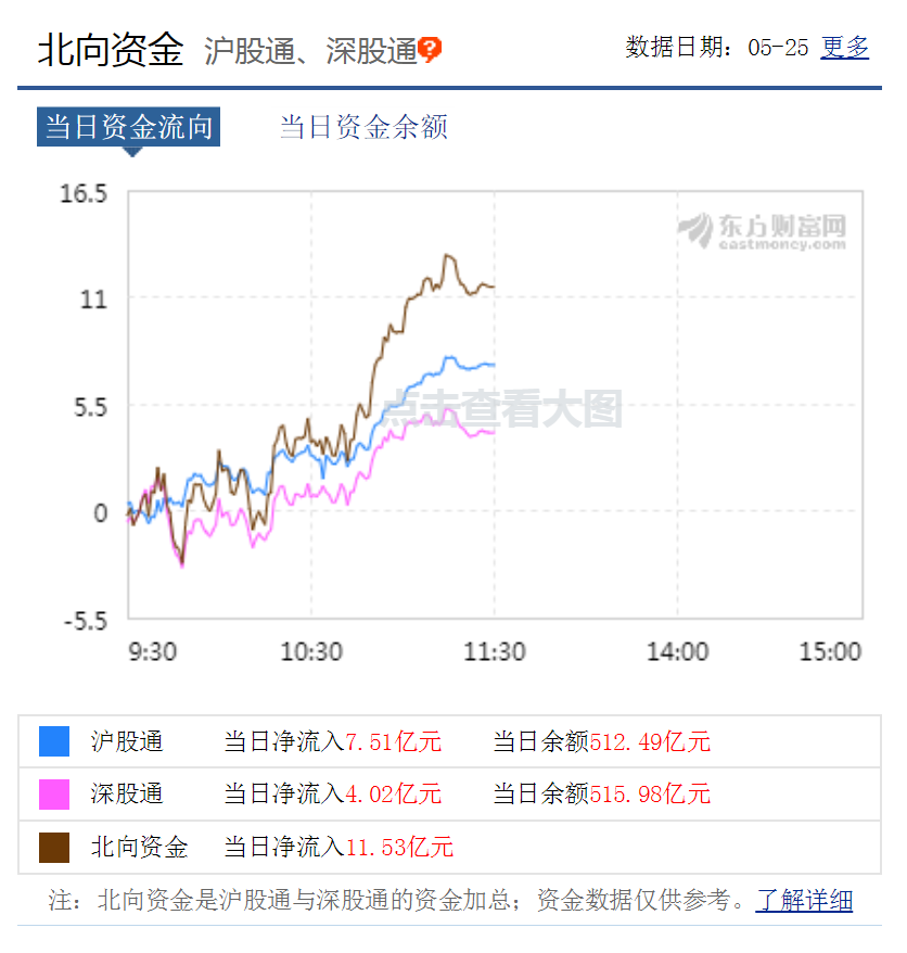 今日,市场继续调整,北向资金仍保持了净流入状态。东方财富网数据显示,截至午间收盘,北向资金净流入11.53亿元,其中沪股通资金净流入7.51亿元,深股通资金净流入4.02亿元。
