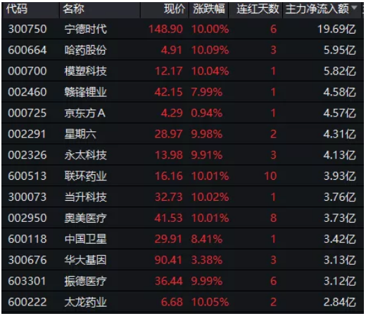 从早盘资金流向来看,52股获主力资金净流入超亿元。动力电池行业龙宁德时代主力资金净流入规模19.69亿元居首。该股今日早盘涨停,最新股价创历史新高,A股市值达到3288亿元。除宁德时代外,哈药股份、模塑科技、赣锋锂业、京东方A、联环药业、星期六等股获主力资金净流入在3亿元以上。