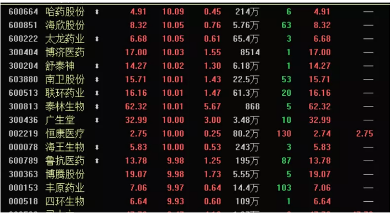 盘面上,肺炎概念指数大涨5.53%领跑涨幅榜。数十只肺炎概念股早盘涨停,分别包括哈药股份、人民同泰、太龙药业、泰达股份、联环药业等,其中联环药业七连板,成为题材最大热门。