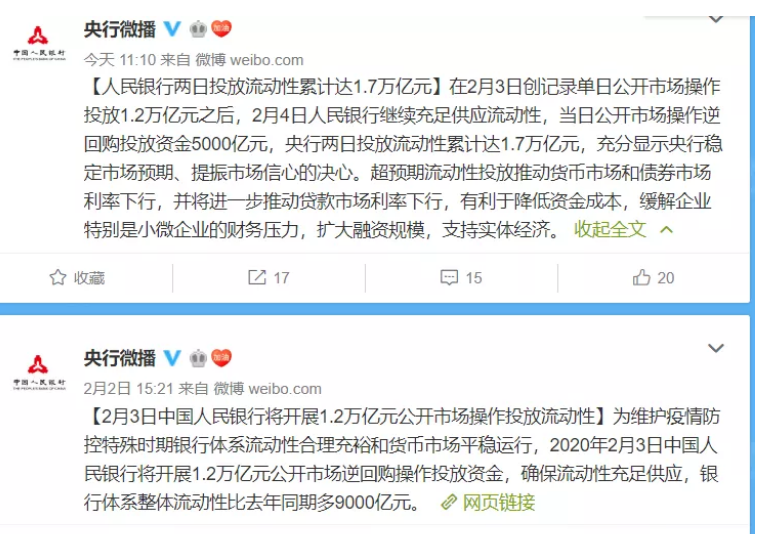 人民银行2月4日称,在2月3日创记录单日公开市场操作投放1.2万亿元后,2月4日人民银行继续充足供应流动性,当日公开市场操作逆回购投放资金5000亿元,央行两日投放流动性累计达1.7万亿元,充分显示央行稳定市场预期、提振市场信心的决心。