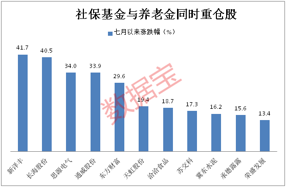 养老金和社保同时重仓个股7月以来股价表现普遍良好,11股平均上涨25.49%,4只个股股价涨幅超过30%,大幅跑赢大盘。新洋丰三季度累计上涨41.74%,养老金二季度加仓后共持有1424.1万股,提升了7.69个百分点,同时社保基金新进持有1416.15万股。据此估计,养老金与社保基金七月以来已分别从新洋丰累计获益超过5000万元。