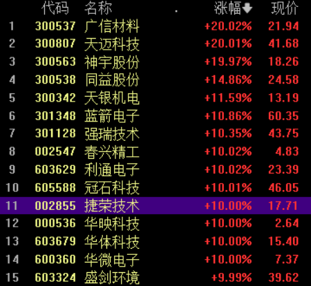 9月6日,华为概念股再度活跃,截至发稿,捷荣技术6连板,广信材料、华映科技、华微电子等逾10股涨停,近30股涨幅达5%以上。