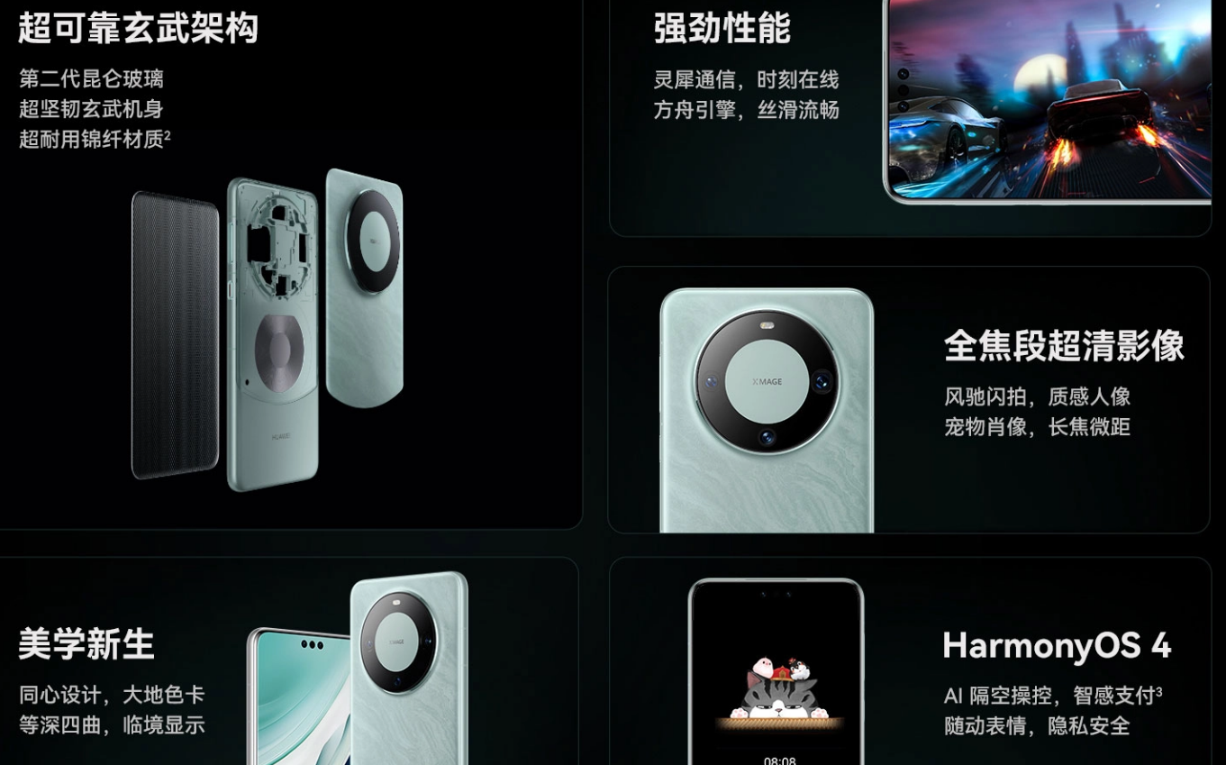 华为Mate60 Pro搭载有雅川青、白沙银、南糯紫、雅丹黑四种配色,并全新推出的超可靠玄武架构,集超耐摔第二代昆仑玻璃、超坚韧玄武机身和超耐用锦纤材质三层防护于一身,搭载全焦段超清影像。