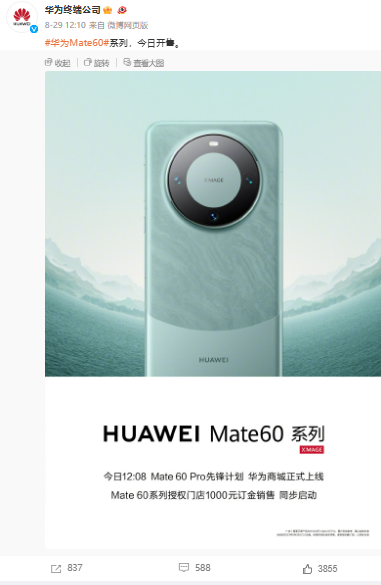 8月29日,华为宣布新一代旗舰手机Mate 60 Pro于当日12时08分正式上线。比市场传闻的发布时间提前了至少半个月,在正式上线后,线上新机在短时间内便售罄。