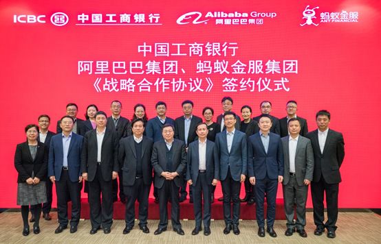 12月16日,中国工商银行与阿里巴巴、蚂蚁金服在京签署全面深化战略合作。在中国工商银行董事长陈四清、阿里巴巴集团董事局主席兼首席执行官张勇的见证下,中国工商银行副行长胡浩、蚂蚁金服总裁胡晓明代表双方签署协议。