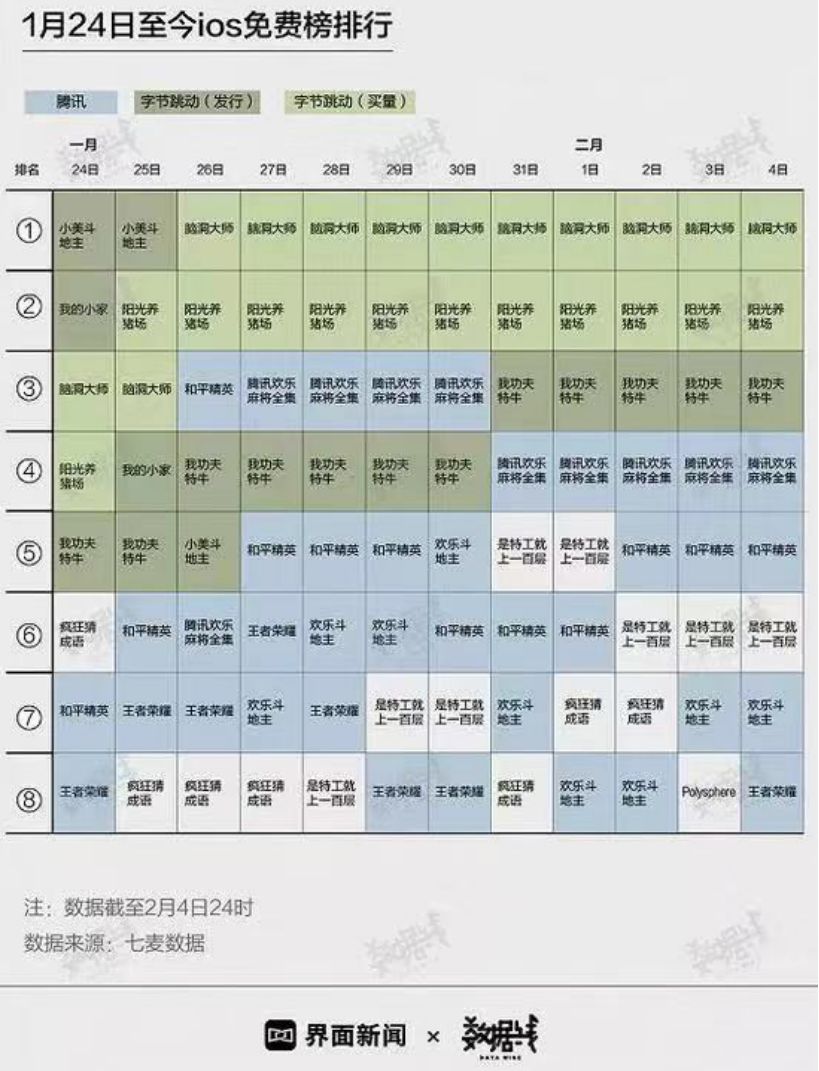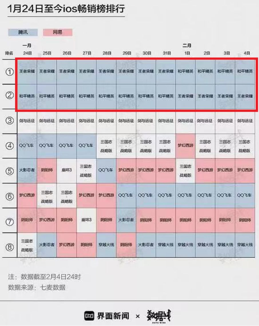 根据市场研究机构七麦数据提供的1月24日-2月4日的游戏榜榜单,《王者荣耀》与《和平精英》交替登顶,《梦幻西游》、《QQ飞车》、《剑与远征》及《阴阳师》这几款游戏竞争激烈。腾讯、网易、灵犀互娱、完美世界和莉莉丝等几家大游戏公司春节期间可谓是赚得盆满钵满。