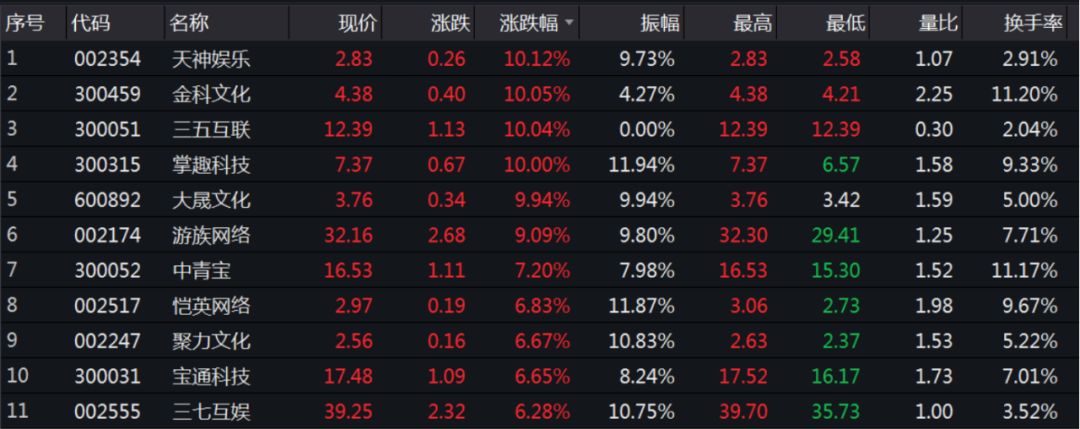 A股方面,截至2月7日收盘,网络游戏指数大涨3.69%,43只成分股中只有4股下跌,其余全线飘红。2月4日以来,共上涨18.16%。个股中,天神娱乐(002354.SZ)、金科文化(300459.SZ)、三五互联(300051.SZ)、掌趣科技(300315.SZ)和大晟文化(600892.SH)已涨停,其中三五互联更是录得七连板。