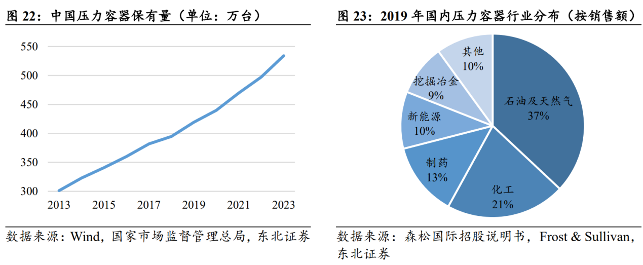 国内压力容器保有量持续上升,油气及化工行业占比过半。压力容器是国家鼓励自主生产的现代工业核心设备,近20年以来我国压力容器保有量呈现出快速上升趋势,至2023年年末已达到533.92万台,市场规模也在同步扩张。压力容器的下游涵盖了多个行业,其中以油气行业及化工行业为主,随着国内对于能源开采及相关工业的发展水平及自主可控程度的要求不断提高,预计产业下游将会对国产压力容器保持旺盛的需求。