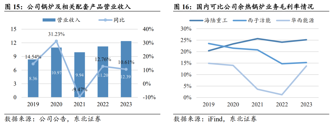 业务营收增长稳健,盈利能力居行业前列。2023年公司锅炉及相关配套产品业务实现营收12.39亿元,同比+10.61%,近五年该业务营收CAGR为7.01%,除2021年同比略有下降外,维持稳健增长趋势;2023年该业务毛利率为25.16%,近年盈利能力改善向好,优于友商余热锅炉业务毛利情况。同时公司在钢铁干熄焦余热锅炉以外,还制造石化及有色冶炼领域余热锅炉产品,形成与友商的错位竞争,保障盈利能力。根据公司官网及公告披露,公司锅炉业务正积极拓展海外市场,目前已在南非、刚果(金)、马来西亚等地部署多套公司锅炉产品,未来有望实现业务新增长。
