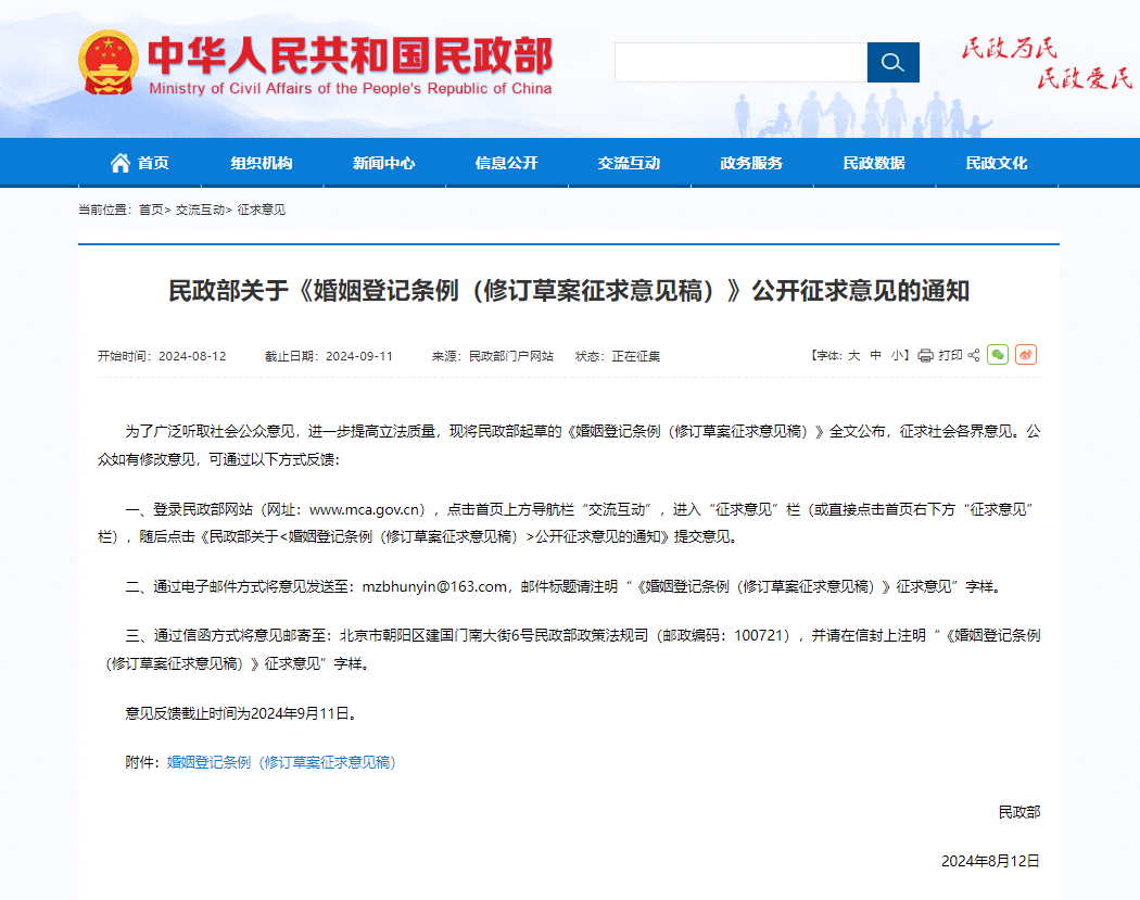 为了广泛听取社会公众意见,进一步提高立法质量,民政部起草的《婚姻登记条例(修订草案征求意见稿)》全文公布,征求社会各界意见。