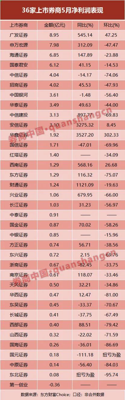 Wind数据显示,截至目前,已有34家上市券商公布5月经营数据,以母公司及下属子公司的合计数据看,华鑫股份、中信建投、兴业证券、财通证券、西南证券、广发证券、申万宏源、东北证券、海通证券、东方证券、南京证券、国元证券12家券商5月净利润同比增长超过100%,华鑫股份、中信建投、兴业证券分别同比增长958.62%、897.77%和850.32%,财通证券、西南证券同比增长超过500%。