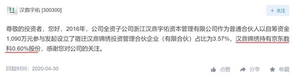 汉鼎宇佑表示,公司全资子公司作为LP以自筹资金1090万元参与发起设立了宿迁汉鼎锦绣投资管理合伙企业(有限合伙),占比3.57%。天眼查显示,汉鼎锦绣目前持有京东数科0.60%股份。