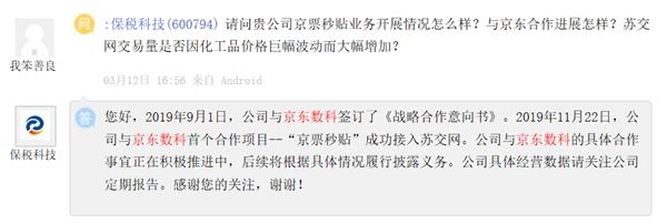 据了解,2019年9月1日,保税科技与京东数科签订了《战略合作意向书》。2019年11月22日,保税科技与京东数科首个合作项目——“京票秒贴”成功接入苏交网。保税科技是一家集码头仓储业务、智慧物流电商平台和供应链金融服务为一体的创新型综合物流服务商。