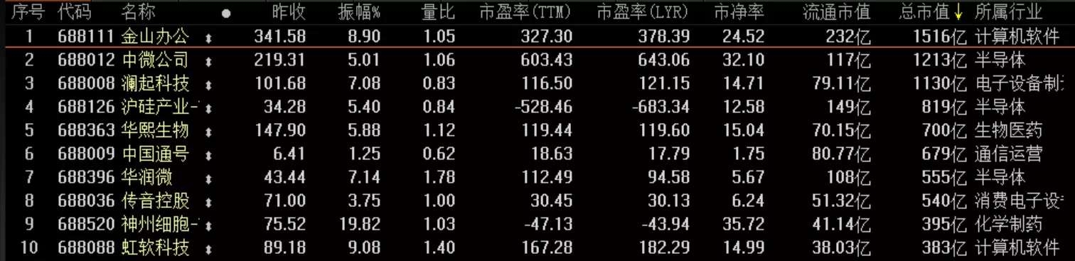 科创板市值前十公司