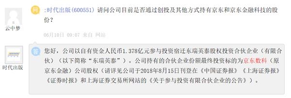 时代出版以自有资金1.378亿元参与投资宿迁东瑞英泰股权投资合伙企业(有限合伙),东瑞英泰目前持有京东数科1.44%股份。