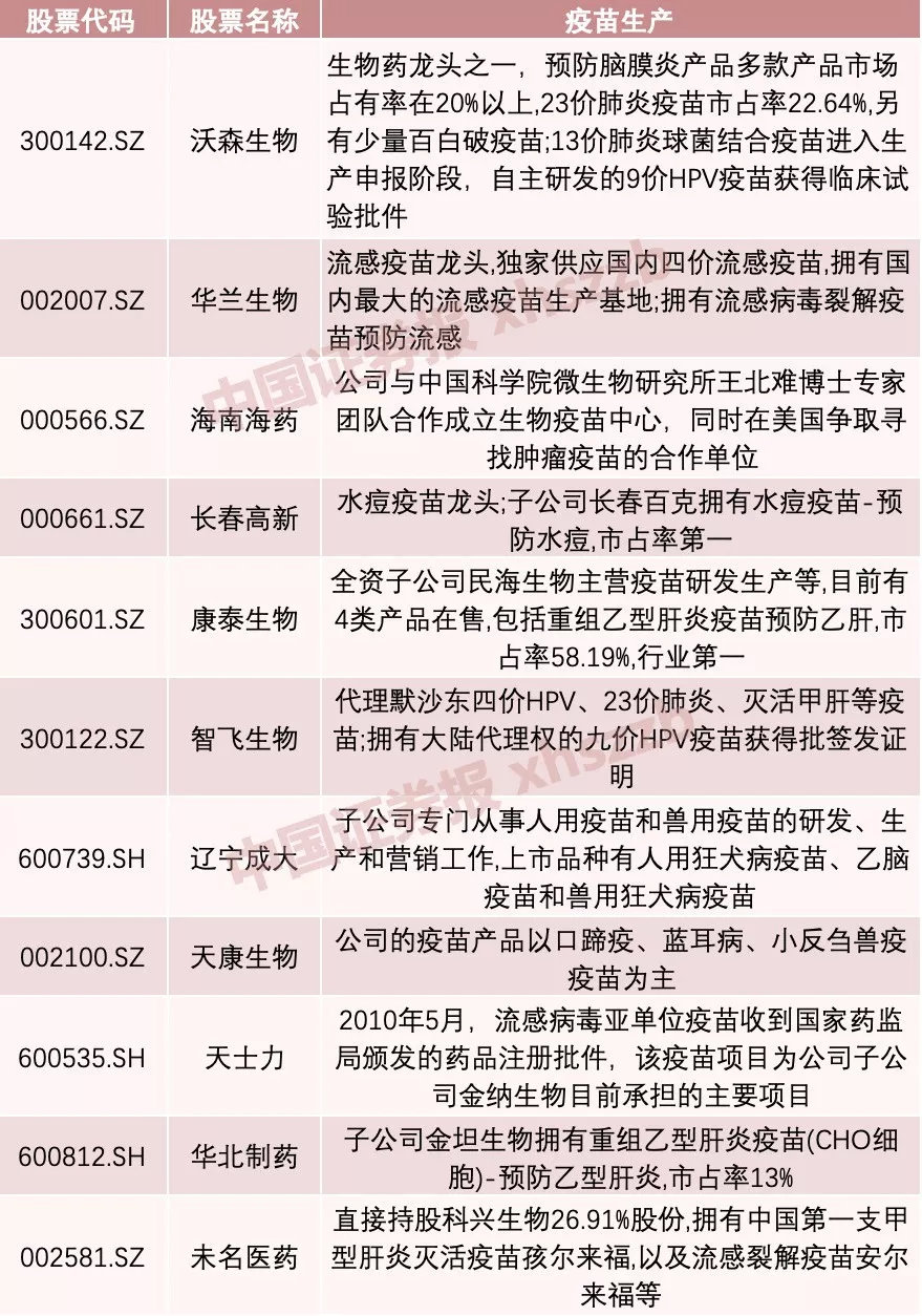 相关数据显示,我国有45家疫苗生产企业,可以生产60种以上的疫苗,能够预防34种疾病,年产能已经超过了10亿剂次。A股上市公司中,直接生产疫苗的企业至少11家。