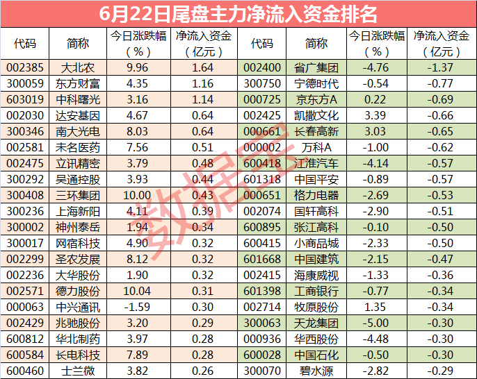 从个股尾盘资金流向数据看,有6股尾盘净流入资金超过5000万元,大北农、东方财富、中科曙光等个股尾盘资金净流入金额最多,分别高达1.64亿元、1.16亿元、1.14亿元;省广集团、宁德时代、京东方A等个股尾盘资金净流出金额最多。
