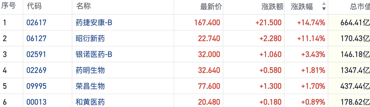 截至发稿,今日药捷安康-B(02617.HK)涨近15%,昭衍新药(06127.HK)涨超11%,银诺医药-B(02591.HK)涨超3%,药明生物(02269.HK)、荣昌生物(09995.HK)等个股也有所跟涨。