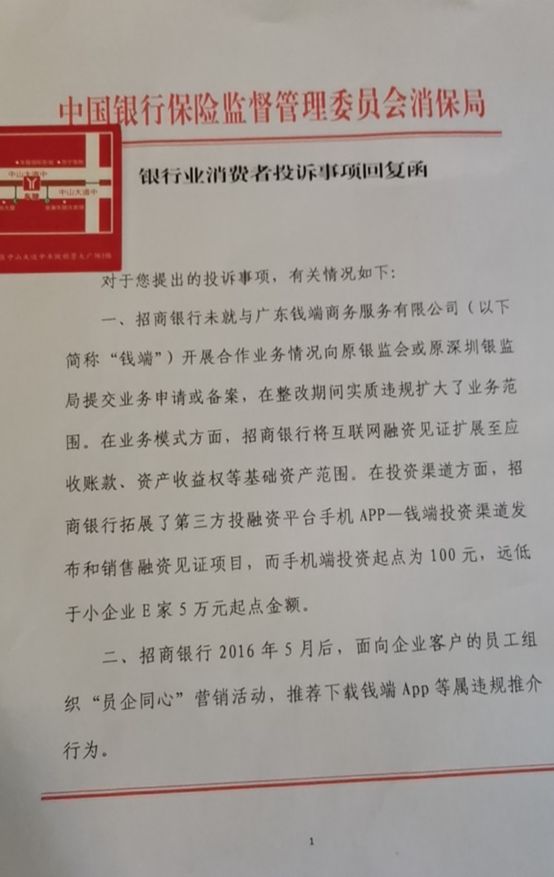 据投资人称,这是钱端一事,首份针对招行总行层面的回复函。