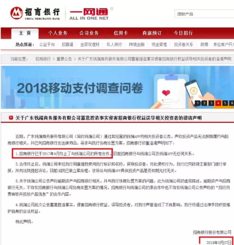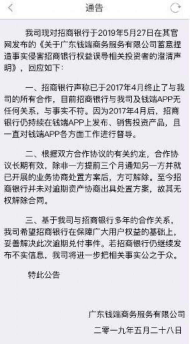 一则回应招商银行的公告,钱端表示“招商银行与钱端没有任何关系,与事实不符。因为2017年4月后,招商银行仍持续在钱端APP上发布、销售投资产品,且一直对钱端APP各方面工作进行督导。”