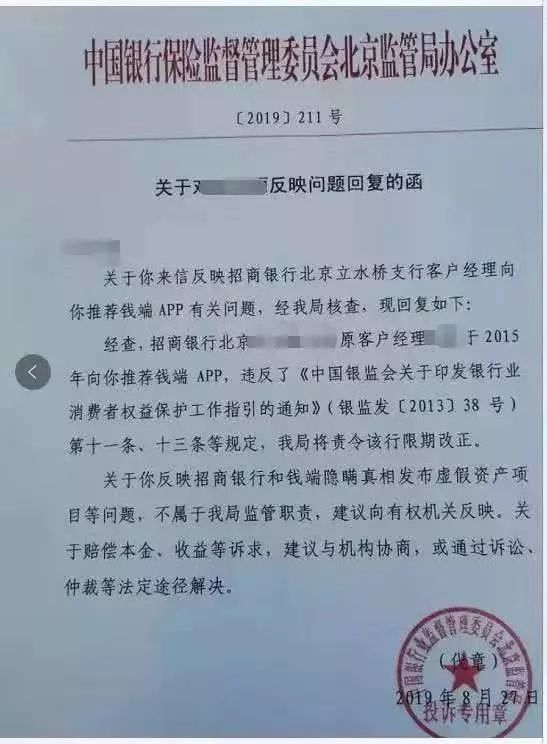 北京银保监局发出的回复函显示,经查,招商银行北京立水桥支行原客户经理于2015年向投诉人推荐钱端APP,违反了《中国银监会关于印发银行业消费者权益保护工作指引的通知》(银监发〔2013〕38号)第十一条、十三条等规定,北京银保监局将责令该行限期改正。