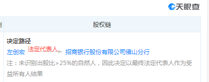 而天眼查资料显示,左创宏目前是招行佛山分行的法定代表人,招商银行股份有限公司佛山分行于2018年10月18日发生工商信息变更,负责人由杨法德变更为左创宏。