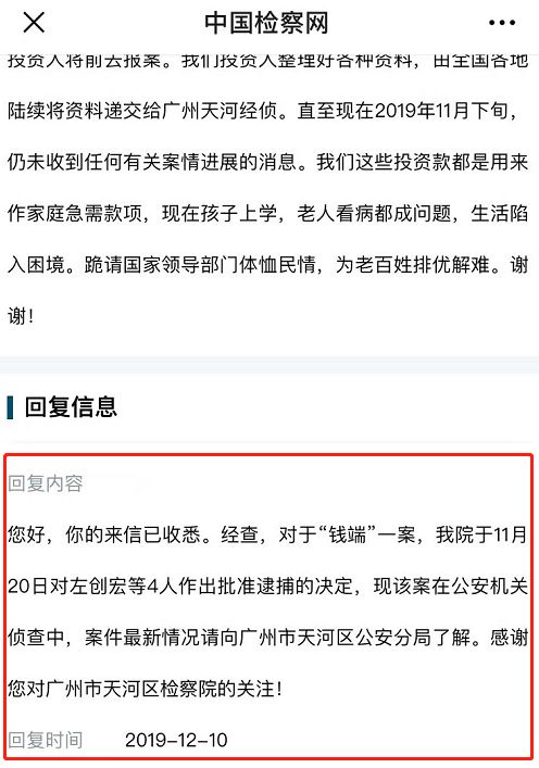 2019年12月11日,广州市天河区检察院于中国检察网回复钱端投资人称,已于11月20日对左创宏等4人作出批准逮捕的决定。
