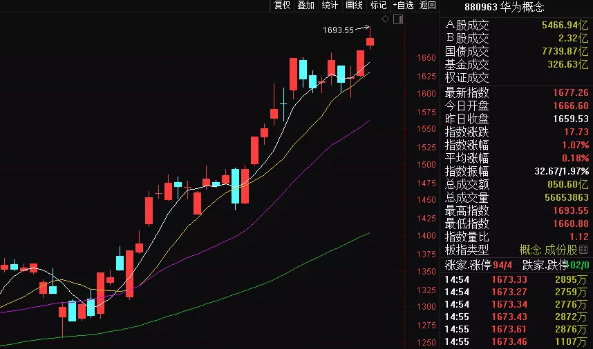 华为概念股自8月份以来就表现得十分强势,华为概念指数在一个多月时间里暴涨30%。苹果概念也同样强势,近一个月,苹果概念指数涨幅也高达25%。