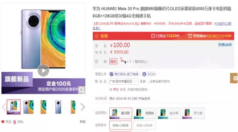 记者了解到,目前国内主要电商平台天猫、京东、苏宁、国美等已开启华为Mate30系列预售。截至9月21日12:00,京东华为官方旗舰店Mate30已预售12794件,Mate30 Pro已预售71820件;天猫华为官方旗舰店Mate30已预售3391件,Mate30 Pro已预售33991件,京东天猫两大平台Mate30已预售3391件,Mate30 Pro已预售33991件,天猫京东两大平台Mate30整体预售已超12万件。